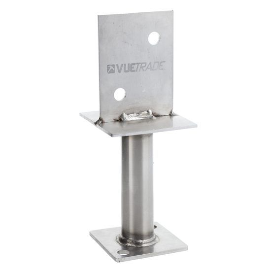 VUETRADE Stainless Steel Centre Blade Post Supports are concealed mounting brackets designed to securely anchor timber posts to concrete footings while maintaining a clean, architectural appearance. The centre blade design installs into a slot cut into the middle of the timber post, creating a modern floating-post look with minimal visible hardware.
